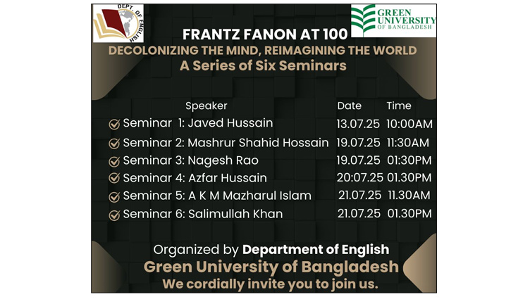 দার্শনিক, বিপ্লবী চিন্তাবিদ ও তাত্ত্বিক ফ্রানৎস ফানোঁর সম্মানে গ্রিন ইউনিভার্সিটির ইংরেজি বিভাগ আয়োজন করেছে ছয় দিনব্যাপী সেমিনার। ‘Fanon at 100 সিরিজ’ নামে এই সেমিনার শুরু হয়েছে ১৩ জুলাই। চলবে ২১ জুলাই পর্যন্ত।
