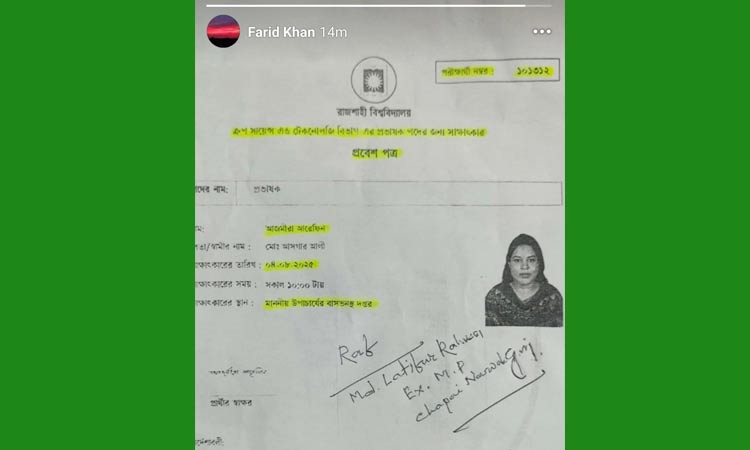 রাজশাহী বিশ্ববিদ্যালয়ের উপ-উপাচার্য (শিক্ষা) অধ্যাপক ড. ফরিদ উদ্দীন খানের ফেসবুক স্টোরিতে শিক্ষক নিয়োগে জামায়াতের সাবেক এমপির সুপারিশ করা প্রবেশপত্র দেখা গেছে। স্টোরি ১৫ মিনিট পরেই ডিলিট করে দেন অধ্যাপক ফরিদ। তবে এটুকু সময়ের মধ্যেই সেই স্টোরির স্ক্রিনশট সামাজিক যোগাযোগমাধ্যমে ছড়িয়ে পড়ে। এ নিয়ে শুরু হয় ব্যাপক সমালোচনা।