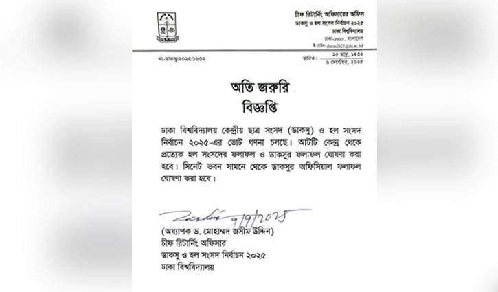 ডাকসু ও হল সংসদ নির্বাচনের প্রধান নির্বাচন কমিশনার অধ্যাপক মোহাম্মদ জসীম উদ্দিন মধ্য রাতে ‘অতি জরুরি বিজ্ঞপ্তি’ জারি করে জানিয়েছেন, আটটি কেন্দ্রে ভোট গণনার পর ডাকসু ও হল সংসদের ফল ঘোষণা করা হবে। আর ডাকসুর অফিসিয়াল ফল ঘোষণা করা হবে সিনেট ভবনের সামনে থেকে।