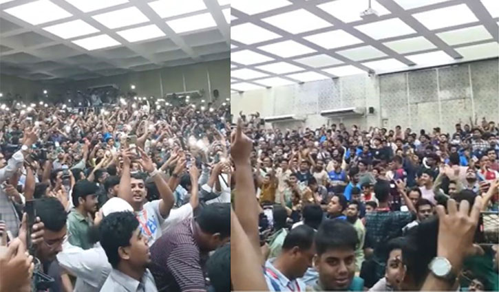 মঙ্গলবার রাত ১২টায় ঢাকা বিশ্ববিদ্যালয়ের সিনেট ভবনে ডাকসুর ভোটের ফল জানতে অপেক্ষমাণ শিক্ষার্থীদের ভিড়। ছবি: রাইজিংবিডি