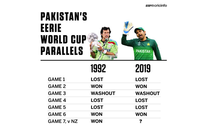 ১৯৯২ বিশ্বকাপে সপ্তম ম্যাচে অপরাজিত নিউজিল্যান্ডকে হারিয়েই সেমি নিশ্চিত করে পাকিস্তান। এবারো প্রতিপক্ষ একই দল এবং এবারো তারা অপরাজিত। যদিও দশ দলের এবারের টুর্নামেন্টে জিতলে সেমি নিশ্চিত বলা যাবে না।