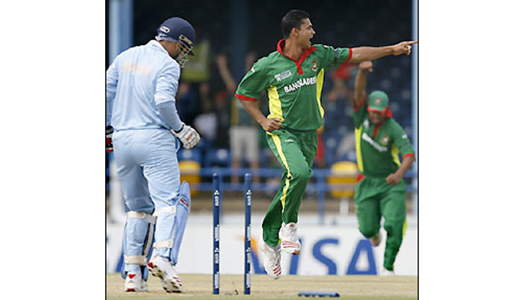কুইন্স পার্ক ওভালে বাংলাদেশের বিপক্ষে ভারত প্রথমে ব্যাট করতে নেমে মাশরাফি বিন মুর্তজা, মোহাম্মদ রফিক ও আব্দুর রাজ্জাকের বোলিং তোপে ৪৯.৩ ওভারে মাত্র ১৯১ রানে অলআউট হয়ে যায়। ভারতের সৌরভ গাঙ্গুলি একমাত্র অর্ধশত রানের দেখা পেয়েছিলেন (৬৬ রান)। শেবাগ, শচীন, উথাপ্পা, দ্রাবিড়, ধোনিদের ক্রিজে দাঁড়াতেই দেননি মাশরাফি-রফিক-রাজ্জাক। ভারতের দশ উইকেট ভাগাভাগি করে নেন এই তিনজন (মাশরাফি ৪টি, রফিক ৩টি ও রাজ্জাক ৩টি)।