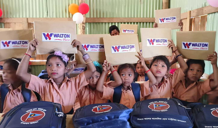 শিক্ষার্থীদের হাতে ওয়ালটন প্লাজার পক্ষ থেকে দেওয়া শিক্ষা সামগ্রী