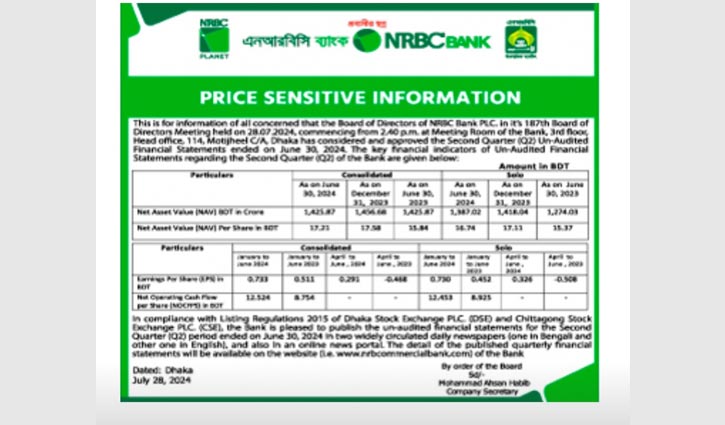পুঁজিবাজারে ব্যাংক খাতে তালিকাভুক্ত কোম্পানি এনআরবিসি ব্যাংক পিএলসির পরিচালনা পর্ষদ চলতি হিসাব বছরের দ্বিতীয় প্রান্তিক (এপ্রিল-জুন, ২০২৪) ও অর্ধবার্ষিক (জানুয়ারি-জুন, ২০২৪) অনিরীক্ষিত আর্থিক প্রতিবেদন প্রকাশ করেছে। প্রকাশিত প্রতিবেদন অনুযায়ী আলোচ্য অর্ধবার্ষিক প্রান্তিকে কোম্পানিটির মুনাফা বেড়েছে।