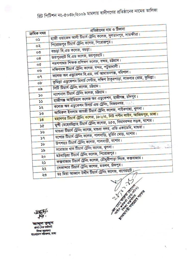 এদিকে গত ২৭ অক্টোবর শিক্ষা মন্ত্রণালয়ের মাধ্যমিক ও উচ্চশিক্ষা বিভাগ থেকে জারি করা এক প্রজ্ঞাপনে বলা হয়েছে, সারাদেশে বেসরকারি বিএড কলেজগুলোর পরিচালনা সংক্রান্ত বিষয়ে শিক্ষা মন্ত্রণালয় হতে ২০০৮ সালের ১৫ মে একটি পরিপত্র জারি করা হয়। উক্ত পরিপত্রের কার্যকারিতার উপর হাইকোর্টের রিট পিটিশন দায়ের করা হয়। হাইকোর্ট বিভাগ উক্ত পরিপত্র বাতিল করে রায় প্রদান করেন। রায়ের বিরুদ্ধে আপিল এবং পরবর্তীতে কনটেম্পট পিটিশন দায়ের করে ২৩টি কলেজ।