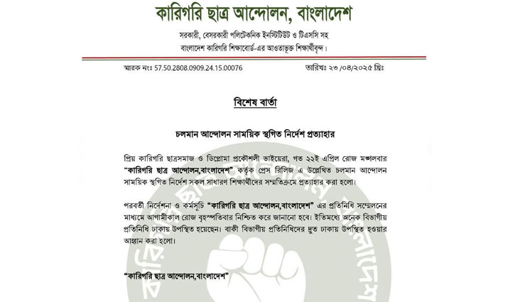 বিজ্ঞপ্তিতে বলা হয়েছে, আন্দোলন সাময়িক স্থগিতের নির্দেশ সাধারণ শিক্ষার্থীদের সম্মতিক্রমে প্রত্যাহার করা হলো।