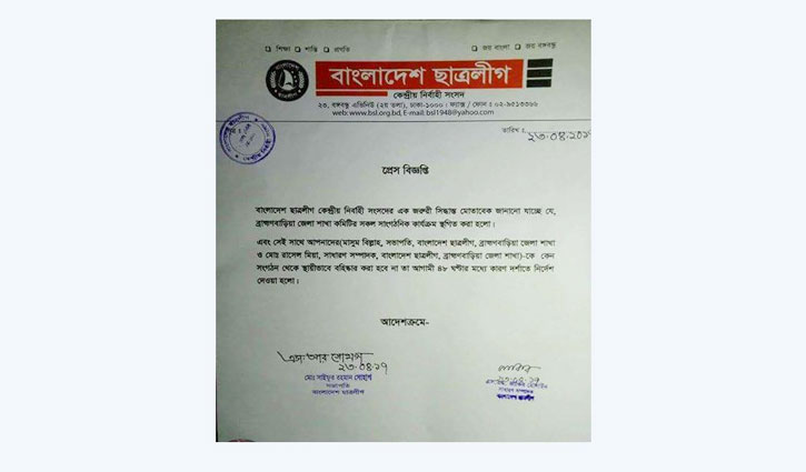 Brahmanbaria Correspondent: All type of political activities of Brahmanbaria district Bangladesh Chhatra League (BCL) was suspended following a clash.