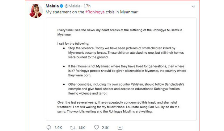 Desk Report: Nobel peace laureate Malala Yousafzai and Muslim countries in Asia led a growing chorus of criticism on Monday aimed at Myanmar and its civilian leader Aung San Suu Kyi over the plight of its Rohingya Muslim minority.