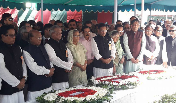 Abdul Hamid and Sheikh Hasina offered Fateha and joined a munajat seeking eternal peace of the departed soul of Bangabandhu as well as other martyrs of the August 15 carnage.