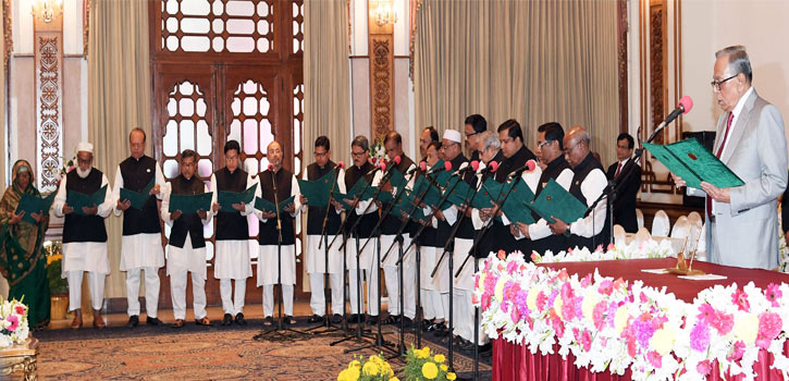 President Abdul Hamid administered the oath to the Prime Minister at 3:39 pm while to 24 ministers at 3:46 pm, to 19 state ministers at 3:53 pm and to three deputy ministers at 3:57 pm at the Darbar Hall of Bangabhaban.