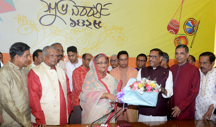 Sheikh Hasina was exchanging greetings of Bangla Naboborsho-1425 form her party leaders and workers at her official residence Ganabhaban on Saturday.