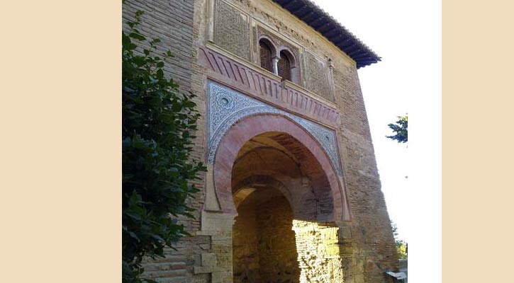 Wine Gate in Alhambra (Arabic Al-Hamra) in Granada Spain exposing old brickwork portion on the right – photograph taken in 2014.