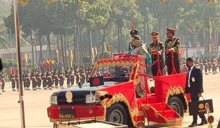 She was accompanied by Chief of Army Staff General SM Shafiuddin Ahmed and BMA Commandant Major General SM Kamrul Hassan while she reviewed the parade riding in an open jeep.