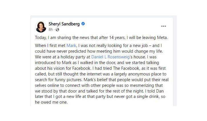 Sheryl Sandberg, the chief operating officer of Facebook's parent company Meta, has announced that she is leaving the business after 14 years.