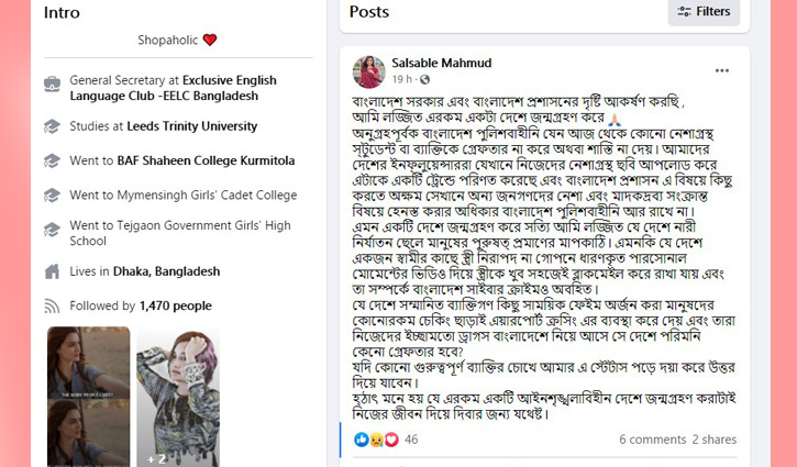 পুরুষের কাছে নারীরা নির্যাতিত হচ্ছেন—এমনটা দাবি করে সালসাবিল বলেন, ‘এমন একটি দেশে জন্মগ্রহণ করে সত্যি আমি লজ্জিত। যে দেশে নারী নির্যাতন ছেলে মানুষের পুরুষত্ব প্রমাণের মাপকাঠি। এমনকি যে দেশে একজন স্বামীর কাছে স্ত্রী নিরাপদ না, গোপনে ধারণকৃত ব্যক্তিগত মুহূর্তের ভিডিও দিয়ে স্ত্রীকে খুব সহজেই ব্ল্যাকমেইল করে রাখা যায় এবং সে সম্পর্কে বাংলাদেশ সাইবার ক্রাইমও অবহিত। যে দেশে সম্মানিত ব্যক্তিগণ কিছু সাময়িক খ্যাতি অর্জন করা মানুষদের কোনোরকম চেকিং ছাড়াই এয়ারপোর্ট ক্রসিংয়ের ব্যবস্থা করে দেয় এবং তারা নিজেদের ইচ্ছামতো ড্রাগস বাংলাদেশে নিয়ে আসে সে দেশে পরিমনি কেন গ্রেপ্তার হবে? যদি কোনো গুরুত্বপূর্ণ ব্যক্তির চোখে আমার এ স্ট্যাটাস পড়ে দয়া করে উত্তর দিয়ে যাবেন। হ্ঠাৎ মনে হয় যে এরকম একটি আইনশৃঙ্খলাবিহীন দেশে জন্মগ্রহণ করাটাই নিজের জীবন দিয়ে দিবার জন্য যথেষ্ট।’