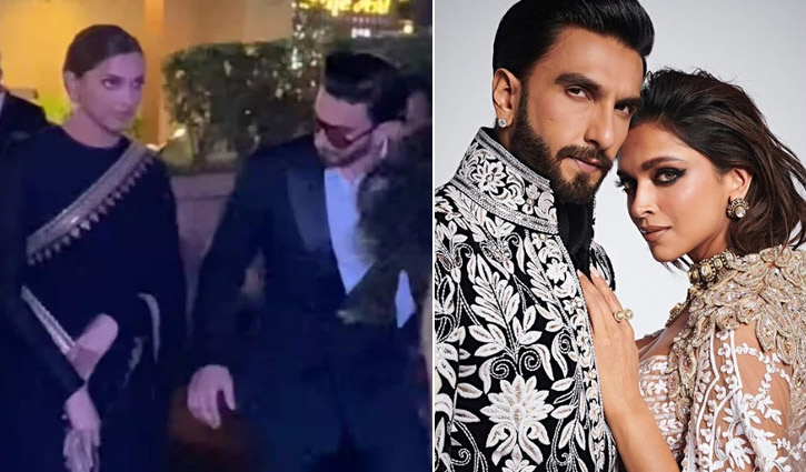 কালো রঙের স্যুট-কোট পরে দাঁড়িয়ে রণবীর সিং। মাথার চুলগুলো ঝুটি করে বাঁধা। কিছুক্ষণ পর গাড়ি থেকে নামেন দীপিকা পাড়ুকোন। এ অভিনেত্রীর পরনেও কালো রঙের শাড়ি।