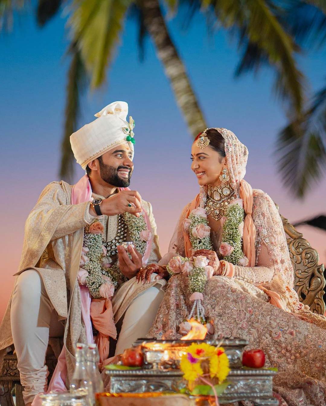 এরই মধ্যে বিয়ের ছবি প্রকাশ্যে এসেছে। তাতে দেখা যায়, হালকা গোলাপি রঙের লেহেঙ্গা পরেছেন রাকুল, সঙ্গে ফ্লোরাল কাজ করা দুপাট্টা মাথায়। পাশাপাশি পরেছেন গোলাপি রঙের চুড়ি, মানানসই গলার হার, কানের দুল, টিকলি। অন্যদিকে জ্যাকির পরেছেন আইভরি রঙের শেরওয়ানি। মাথায় সাদা রঙের পাগড়ি।