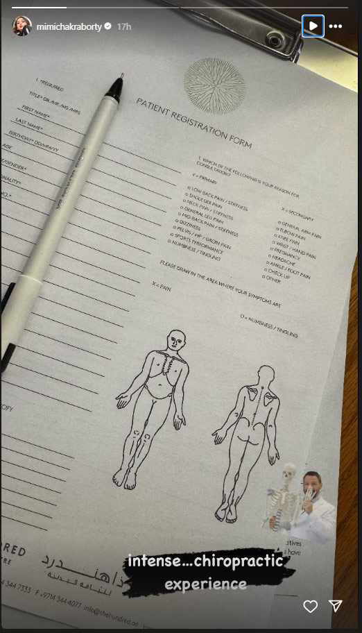 মিমি চক্রবর্তীর ইনস্টাগ্রাম পোস্টে দেখা যায়, চিকিৎসার জন্য রোগী হিসেবে রেজিস্ট্রেশন ফর্ম পূরণ করেছেন মিমি। তাতে লেখা— ‘ইনটেন্স কায়রো প্র্যাকটিক’। কিন্তু ‘ইনটেন্স কায়রো প্র্যাকটিক’ কী?