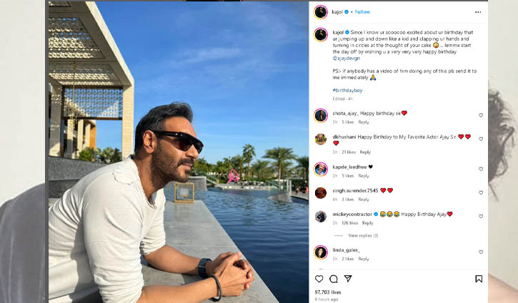 কাজলের স্ট্যাটাস- ‘আমি জানি, তুমি তোমার জন্মদিন নিয়ে খুবই আনন্দিত। তুমি এতোটাই উচ্ছ্বসিত যে শিশুদের মতো লাফিয়ে উঠেছো, হাতে তালি দিচ্ছো। এবং কেকের চারপাশে ঘুরঘুর করছো। তোমাকে জন্মদিনের অনেক অনেক শুভেচ্ছা অজয় দেবগন।’ এরপর কাজল লিখেছেন,‘যদি কারও কাছে এই আনন্দঘন সময়ের ভিডিও থাকে তো পাঠাও।’