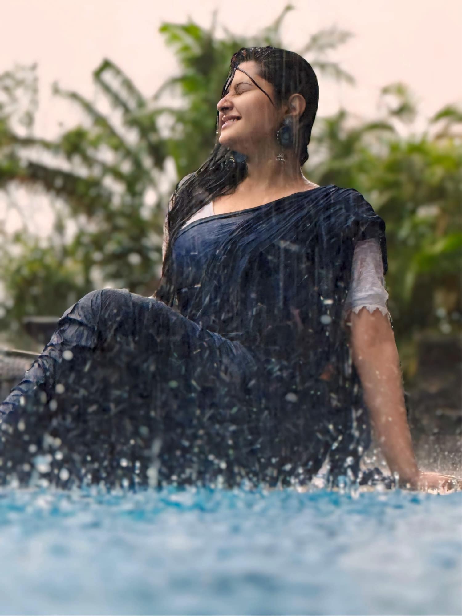 জলে পা ডুবিয়ে বসে আছেন পরীমণি। তার পরনে শাড়ি। মুষলধারায় বৃষ্টি ঝরছে। ভেজা চুলগুলো আলগা করে ছেড়ে দেওয়া। দু’চোখ বন্ধ করে বৃষ্টির স্পর্শ গভীরভাবে অনুভব করছেন।