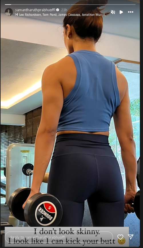 সামান্থার পরনে ব্যায়ামের পোশাক। দুই হাতে ডাম্বেল। ক্যামেরার বিপরীত দিকে মুখ করে দাঁড়িয়ে আছেন ভারতের দক্ষিণী সিনেমার এই নায়িকা। ইনস্টাগ্রাম স্টোরিতে শেয়ার করা একটি ছবিতে এমন লুকে দেখা যায় সামান্থাকে।