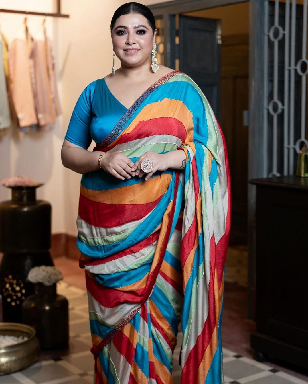 পরনে সবুজ রঙের ভারী কাঞ্জিভরম শাড়ি। গলায় সোনালি রঙের নেকলেস। কপালে টিপ, সিঁথিতে শোভা পাচ্ছে সিঁদুর। এমন সাজে পাওয়া গেল ভারতীয় বাংলা সিনেমার নায়িকা শুভশ্রী গাঙ্গুলির বোন অভিনেত্রী দেবশ্রী গাঙ্গুলিকে।