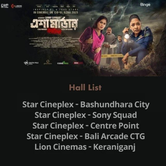 ‘এশা মার্ডার: কর্মফল’ সিনেমাটি গত বছরই মুক্তি পাওয়ার কথা থাকলেও শেষ পর্যন্ত আর মুক্তি দেননি ছবিটির প্রযোজক। এবার ঈদুল ফিতরেও সিনেমাটি মুক্তির কথা ছিল। পরে জানা যায়, সিনেমাটির কিছু অংশের শুটিং বাকি রয়েছে। অবশেষে এটি মুক্তি পেল ঈদুল আজহায়। সানী সানোয়ার পরিচালিত এ সিনেমায় অভিনয় করেছেন আজমেরী হক বাঁধন, পূজা ক্রুজ, মিশা সওদাগর প্রমুখ।