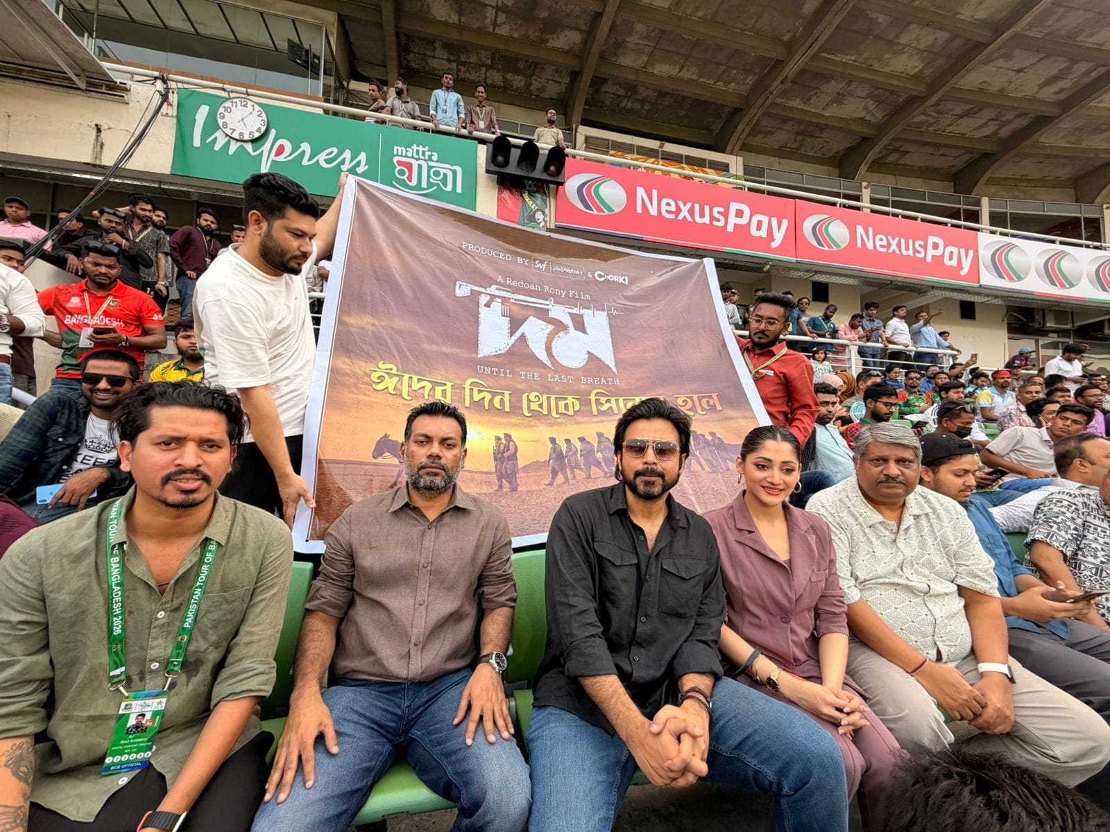 রাজধানীর মিরপুর শেরেবাংলা জাতীয় ক্রিকেট স্টেডিয়ামে রবিবার (১৫ মার্চ) অনুষ্ঠিত হয় বাংলাদেশ-পাকিস্তানের মধ্যকার তৃতীয় ওয়ানডে ম্যাচ। এদিন গ্যালারিতে উপস্থিত থেকে টাইগারদের উৎসাহ জুগিয়েছে বহুল আলোচিত ‘দম’ চলচ্চিত্রের টিম। ম্যাচে টানটান উত্তেজনার মাঝে শোবিজ তারকাদের উপস্থিতি গ্যালারিতে নতুন মাত্রা যোগ করে।