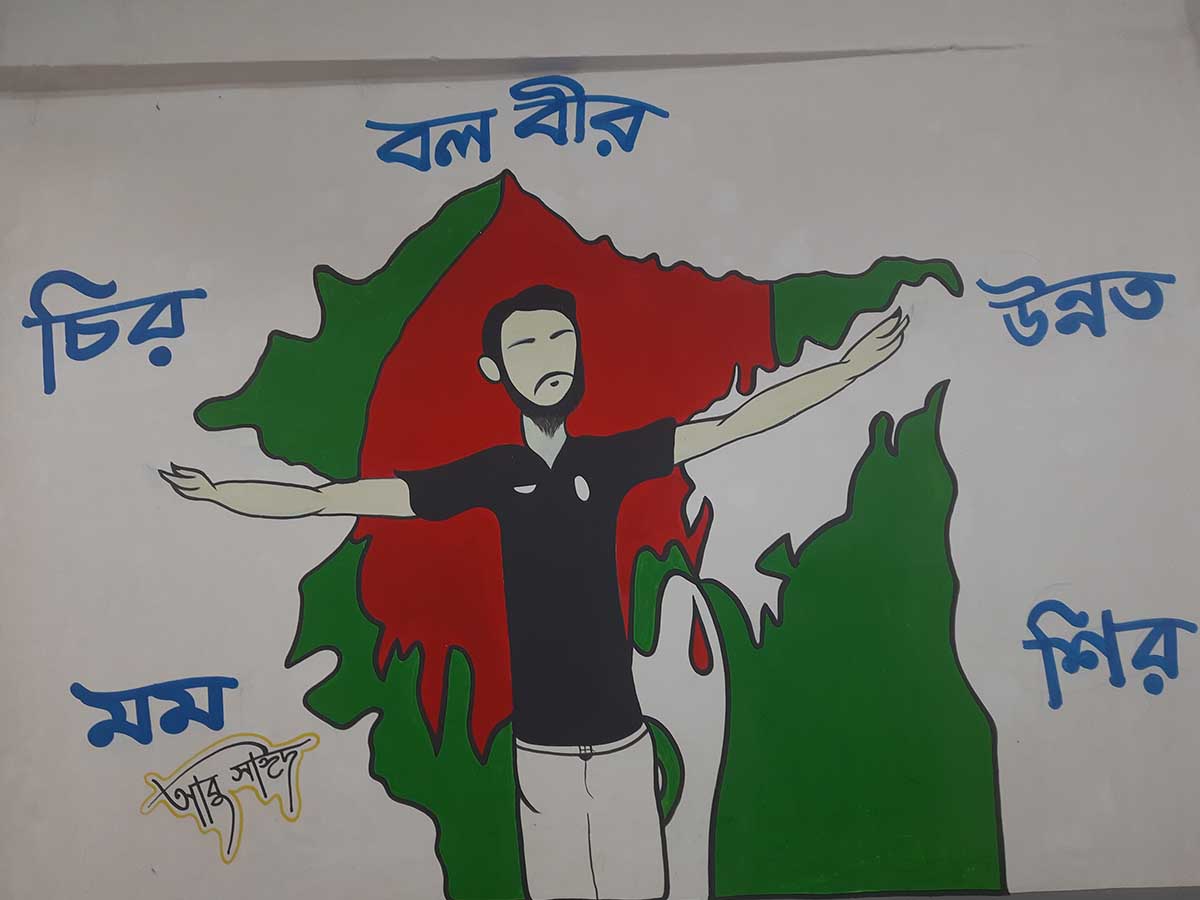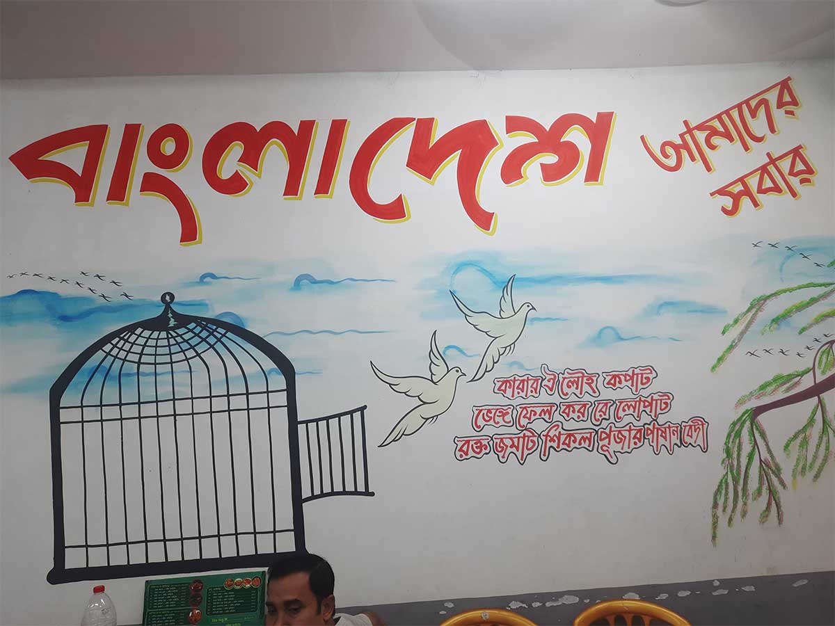 দেয়ালজুড়ে ছাত্র-জনতার আন্দোলনের গ্রাফিতি আঁকা বিষয়ে তিনি বলেন, ‘জুলাই বিপ্লবে ছাত্ররা প্রাণ দিয়েছে। আমরা চাইছি ওদের স্মৃতি ধরে রাখতে।’