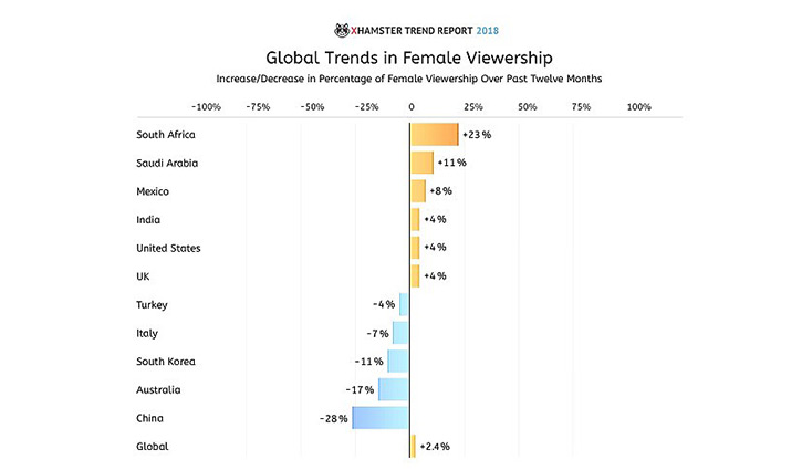 এক্সহ্যামস্টার সাইটটির তথ্যানুযায়ী, সৌদি আরবে নারী পর্নো ব্যবহারকারীর সংখ্যা ১১ শতাংশ বেড়েছে। চীনে পর্নো দেখায় নারী ব্যবহারকারীর সংখ্যা ২৮ শতাংশ কমেছে।