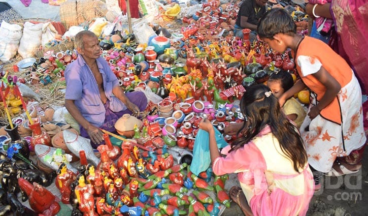 হিম শীতল বাতাসে মিলিয়ে যায় কৃষ্ণা রানী মণ্ডলের উনুনের ধোঁয়া। খানিক জায়গা নিয়ে ছোট্ট চায়ের দোকান। এক কোণে মাটির উনুন। কমলা প্রিন্ট চকচকে কাপড় দিয়ে সাজানো দোকানের চারপাশ। চায়ের সঙ্গে আছে কিছু বিস্কিট আর পান সিগারেট। এতেই বেশ ভিড়। ভিড় ঠেলে ভেতরে ঢোকাই কঠিন! গরম উনুন থেকে চায়ের কেটলি থেকে গলগল করে নামছে চা। ভরছে কাপ। যাচ্ছে হাতে হাতে। কৃষ্ণার নেই ফুরসৎ। খানিক দূরে মিষ্টির দোকানে সতীশ ময়রাও সহযোগীদের নিয়ে খুব ব্যস্ত। খেলনাওয়ালাদের দোকানে ভিড় আরও বেশি।