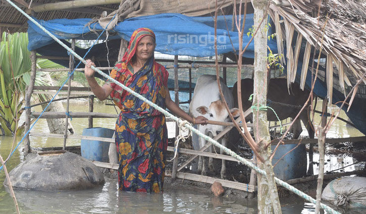 নুবাইদ যে বেড়িবাঁধের ওপর দাঁড়িয়ে কথা বলছিলেন, সেটাকে বাঁধ না বলে জমির ‘আইল’ বলাই ভালো। অনতিদূরেই গ্রামের বাঁধের ধ্বসে যাওয়া অংশ। সেখানেই ছিল আবুল বাশার শেখের বাড়ি। বাড়ির ওপর দিয়ে বয়ে গিয়েছিল আম্পানের প্রবল স্রোত। আবুল বাশার বললেন, ‘আমরা খেটে খাওয়া মানুষ। ঘের মালিকদের কোনো সমস্যা নাই। শহরে তাদের বাড়ি আছে; গ্রামে না-এলেও চলে। ভোগান্তি সব গরিব মানুষের।’