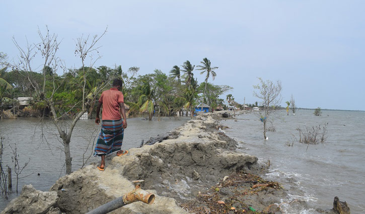 বেড়িবাঁধ এভাবেই নাজুক অবস্থায় পড়ে থাকে। গাবুরার নাপিতখালী গ্রামের ছবি