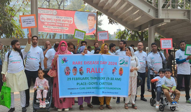 বৃহস্পতিবার (২৯ ফেব্রুয়ারি) কিউর এসএমএ বাংলাদেশের পক্ষ থেকে আয়োজিত র্যালী এবং মানববন্ধনে বক্তারা এসব কথা বলেন। ২৯ ফেব্রুয়ারি বিরল ব্যাধি দিবস বা রেয়ার ডিজিস ডে উপলক্ষে এই সচেতনতামূলক কর্মসূচির আয়োজন করা হয়।
