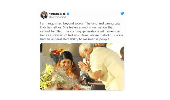শোক প্রকাশ করেছেন ভারতের প্রধানমন্ত্রী নরেন্দ্র মোদি। তিনি বলেন, আমি ভাষা হারিয়েছি। অত্যন্ত দয়ালু ও আজরের লতাদিদি আমাদের ছেড়ে চলে গেলেন।