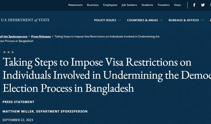 নির্বাচন প্রক্রিয়ায় বাধাদানকারীদের ওপর মার্কিন ভিসা নীতি কার্যকর