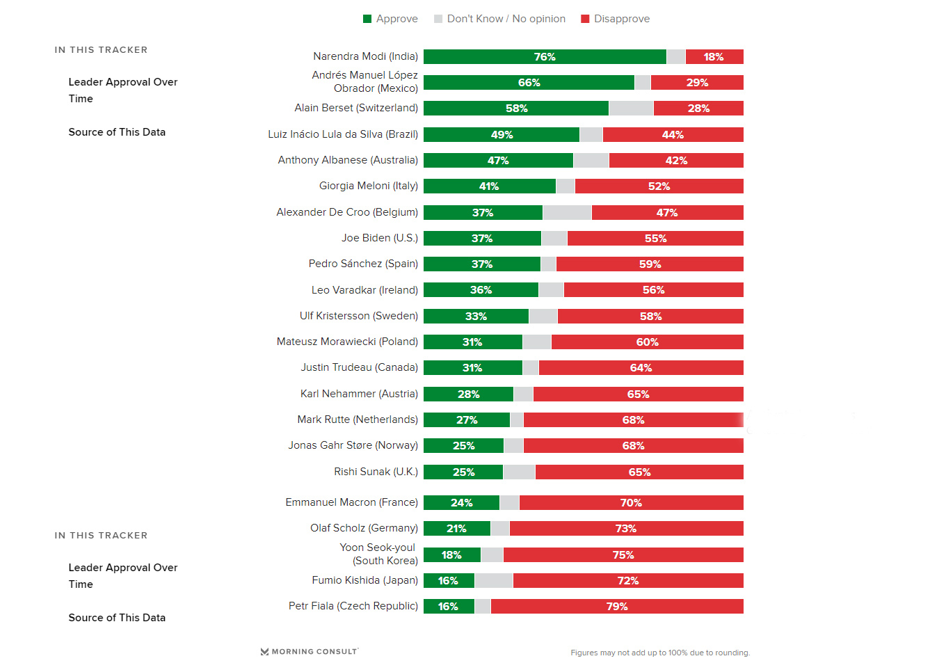 মর্নিং কনসাল্ট অস্ট্রেলিয়া, অস্ট্রিয়া, ব্রাজিল, জার্মানি, ভারত, মেক্সিকো, নেদারল্যান্ডস, দক্ষিণ কোরিয়া, স্পেন, সুইডেন, যুক্তরাষ্ট্রসহ মোট ২২টি দেশের সরকারের জনপ্রিয়তা যাচাইয়ের ভিত্তিতে তালিকা প্রস্তুত করে থাকে। আন্তর্জাতিকভাবে প্রতিদিন ২০ হাজারের বেশি সাক্ষাৎকার নিয়ে থাকে মর্নিং কনসাল্ট।