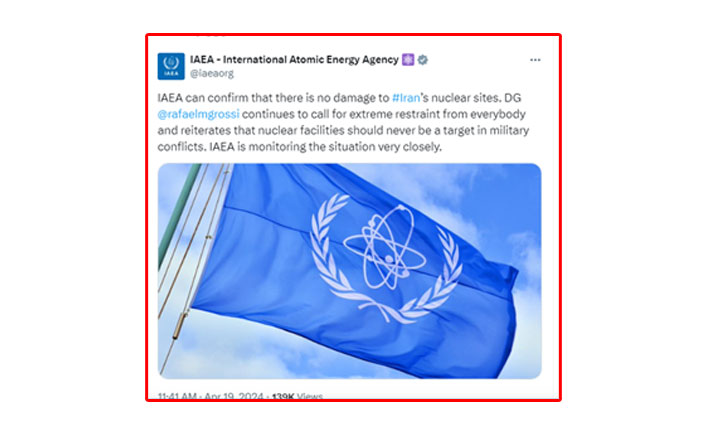 জাতিসংঘের এই সংস্থাটির মহাপরিচালক রাফায়েল মারিয়ানো গ্রসি শুক্রবার (১৯ এপ্রিল) সামাজিক যোগাযোগ মাধ্যম এক্সে বলেছেন, পারমাণবিক স্থাপনাগুলো সামরিক সংঘাতের লক্ষ্য হওয়া উচিৎ নয়। তিনি সবাইকে সর্বোচ্চ ধৈর্য্য ধারণ করার আহ্বান জানিয়েছেন।