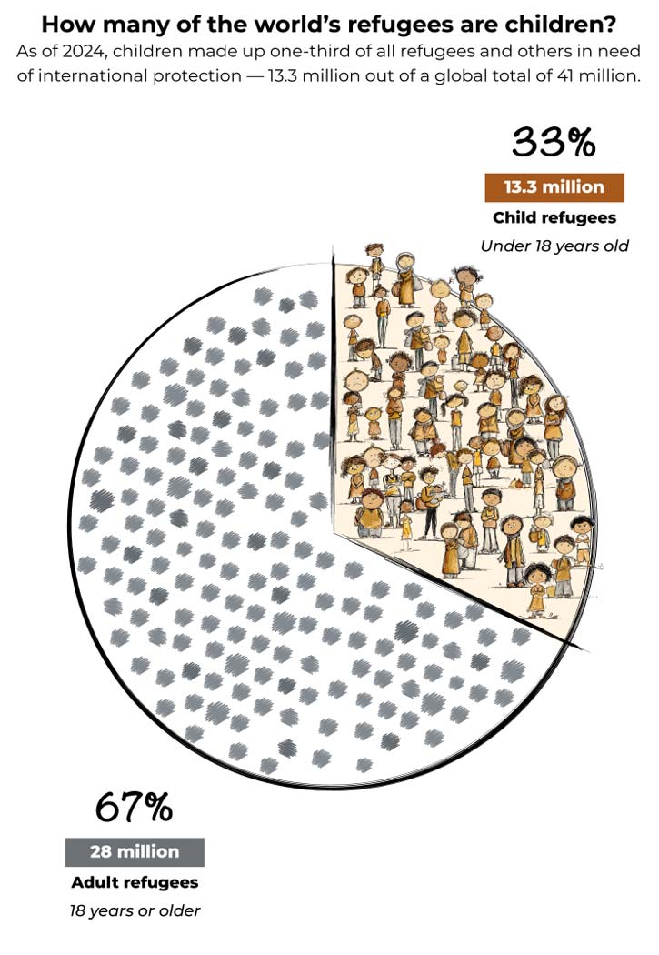 এর মানে, প্রতি ১০০ জন শরণার্থীর মধ্যে ৩৩ জনই শিশু, যারা সবাই আন্তর্জাতিক সুরক্ষার প্রয়োজনের মধ্যে রয়েছে।