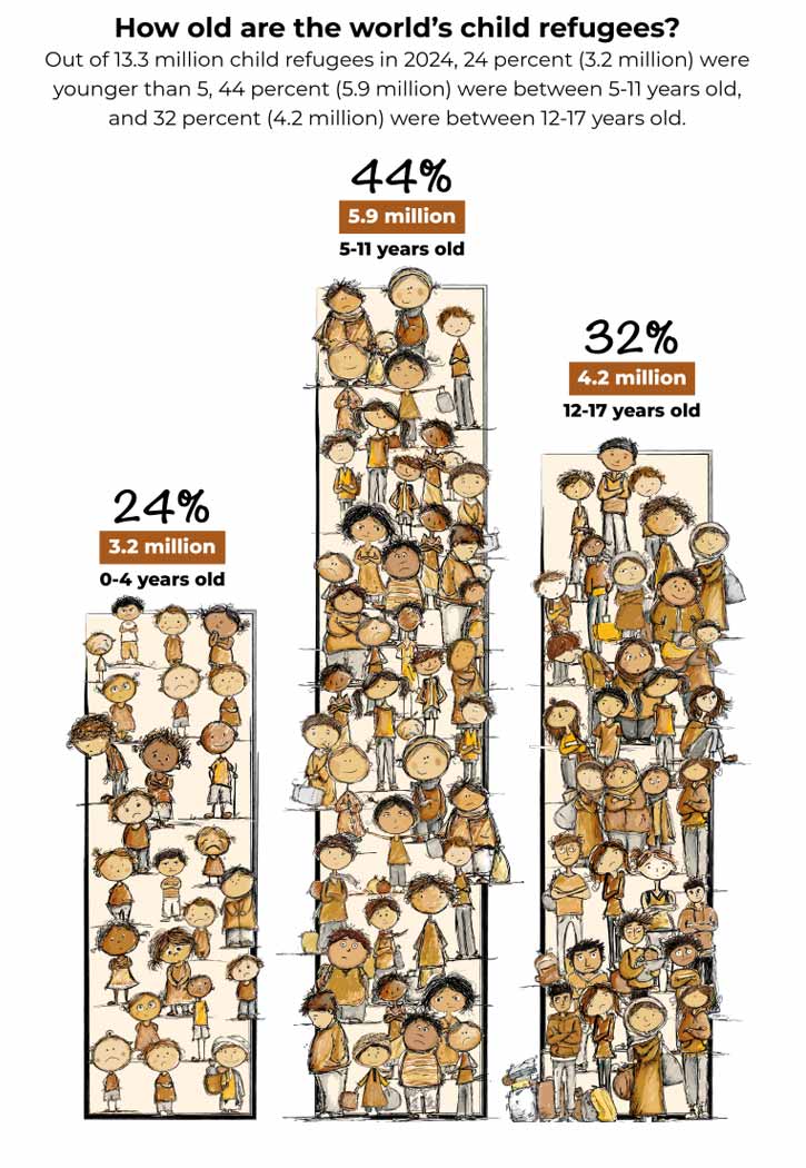 ২০২৪ সালে শিশু শরণার্থীদের মধ্যে ৪৪ শতাংশ (৫৯ লাখ) ছিল ৫-১১ বছর বয়সি। এরপর ৩২ শতাংশ (৪২ লাখ) ছিল ১২-১৭ বছর বয়সি এবং ২৪ শতাংশ (৩২ লাখ) ছিল ০-৪ বছর বয়সি।