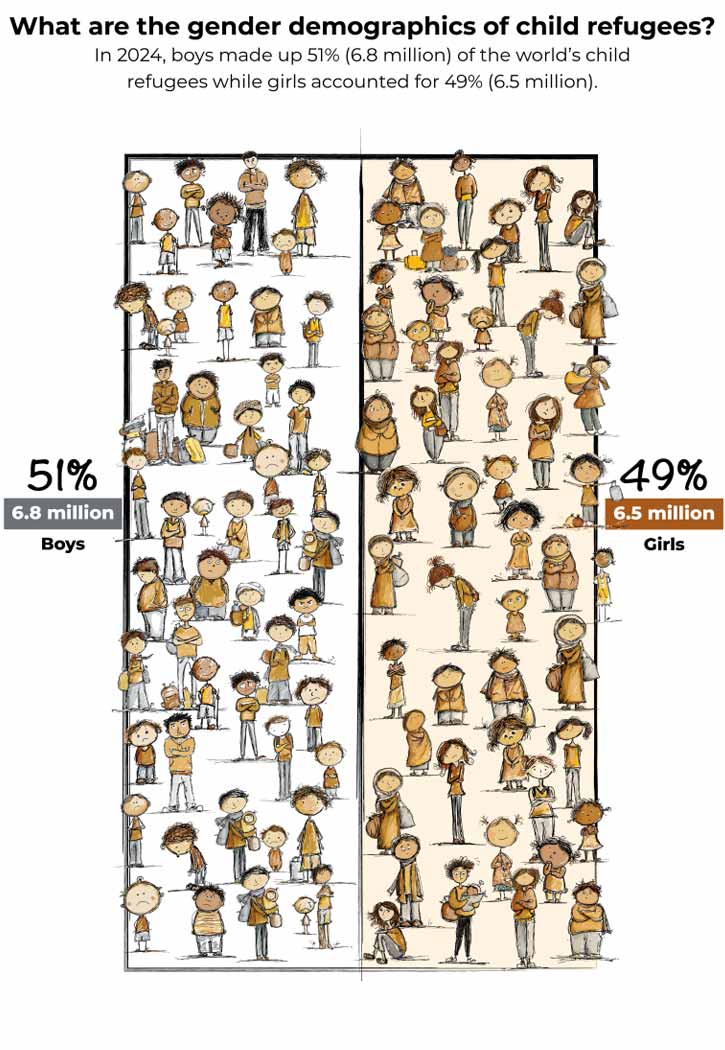 জাতিসংঘের শরণার্থী সংস্থার (ইউএনএইচসিআর) সর্বশেষ পরিসংখ্যান অনুযায়ী, শিশু শরণার্থীদের ৬৮ লাখ (৫১ শতাংশ) ছেলে এবং ৬৫ লাখ (৪৯ শতাংশ) মেয়ে।