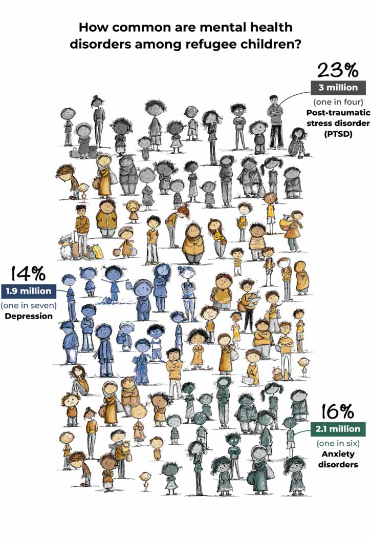 এক গবেষণায় দেখা গেছে, শরণার্থী শিশুদের মধ্যে পোস্ট-ট্রমাটিক স্ট্রেস ডিসঅর্ডারের (পিটিএসডি) হার ২৩ শতাংশ (প্রতি চারজনে একজন), উদ্বেগজনিত মানসিক রোগ ১৬ শতাংশ (প্রতি ছয়জনে একজন) এবং বিষণ্নতা ১৪ শতাংশ (প্রতি সাতজনে একজন)।