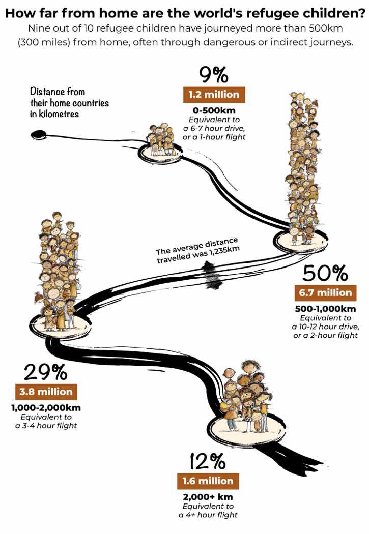 জাতিসংঘের শরণার্থী সংস্থার তথ্য বিশ্লেষণ করে পাওয়া যায়, প্রতি ১০ জন শিশু শরণার্থীর মধ্যে ৯ জনই আশ্রয়ের জন্য নিজের ঘর থেকে ৫০০ কিলোমিটার বা তার বেশি দূরত্ব হেঁটেছে।