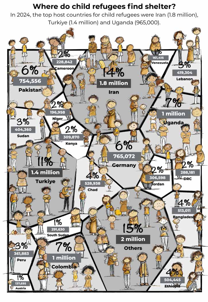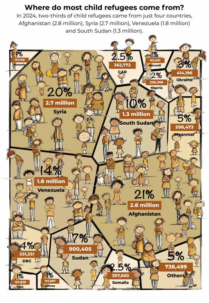 ২০২৪ সালে শিশু শরণার্থীদের দুই-তৃতীয়াংশই সৃষ্টি হয়েছে মাত্র চারটি দেশ থেকে। এর মধ্যে ২১ শতাংশ (২৮ লাখ) আফগানিস্তান থেকে, ২০ শতাংশ (২৭ লাখ) সিরিয়া থেকে, ১৪ শতাংশ (১৮ লাখ) ভেনিজুয়েলা থেকে এবং ১০ শতাংশ (১৩ লাখ) দক্ষিণ সুদান থেকে শিশুরা শরণার্থী হয়েছে।