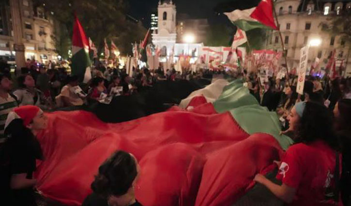 আর্জেন্টিনা: বুধবার রাতে ভূমধ্যসাগরে গাজা থেকে প্রায় ১২০ কিলোমিটার দূরে ওই নৌযানগুলোয় ঢুকে পড়ে ইসরায়েলি সেনারা। এ ঘটনার প্রতিবাদে আর্জেন্টিনার রাজধানীতে বিক্ষোভ হয়েছে। বিভিন্ন সংগঠনের কর্মীরা রাস্তায় নেমে ত্রাণ বহর আটকানোর ঘটনায় ক্ষোভ প্রকাশ করেন।