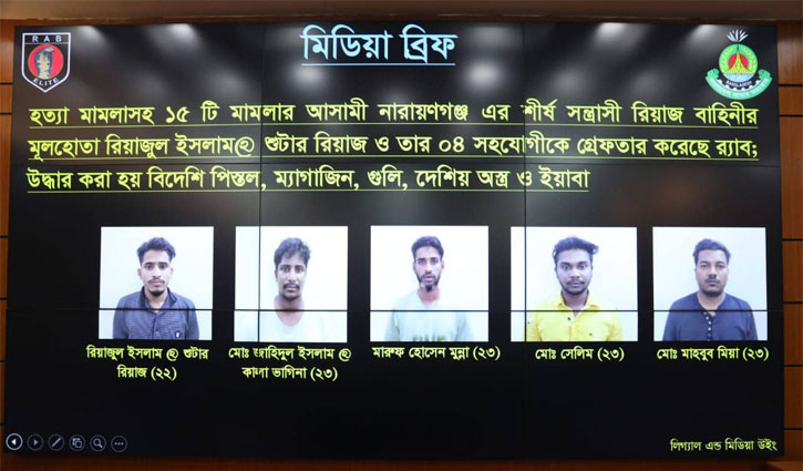 হত্যা মামলাসহ ১৫টি মামলার আসামি নারায়ণগঞ্জের শীর্ষ সন্ত্রাসী রিয়াজ বাহিনীর মূলহোতা রিয়াজুল ইসলাম ওরফে শুটার রিয়াজ ও তার ৪ সহযোগীকে গ্রেপ্তার করেছে র্যাব।