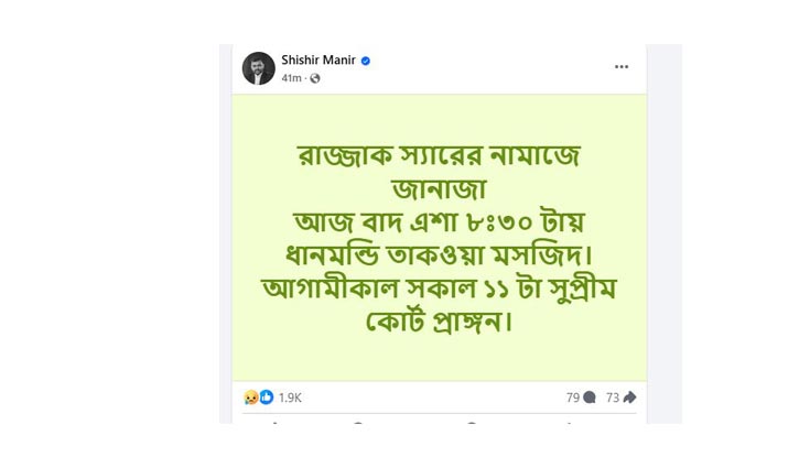 শিশির মনির আরেক পোস্টে লিখেছেন, আজ বাদ এশা (৮.৩০টা) ধানমন্ডির তাকওয়া মসজিদে এবং আগামীকাল সোমবার সকাল ১১টায় সুপ্রিম কোর্ট প্রাঙ্গণে ব্যারিস্টার আবদুর রাজ্জাকের জানাজা অনুষ্ঠিত হবে।
