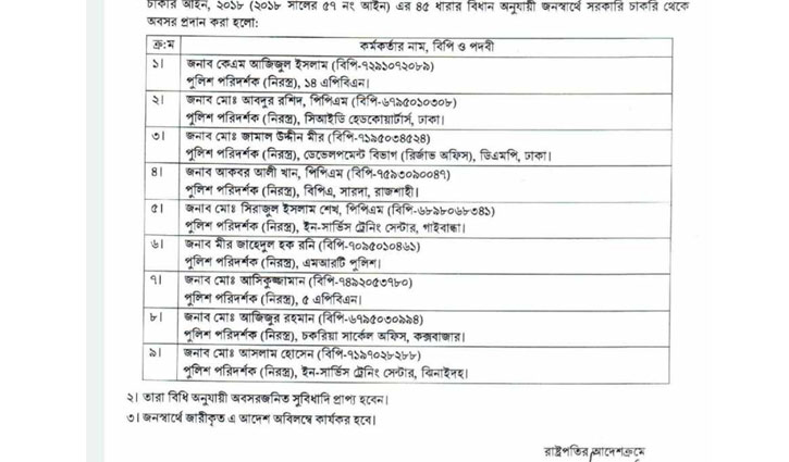 প্রজ্ঞাপনে বলা হয়েছে, বাংলাদেশ পুলিশে কর্মরত নিম্নবর্ণিত ০৯ জন পুলিশ কর্মকর্তার চাকরি ২৫ বছর পূর্ণ হওয়ায় সরকারি চাকরি আইন, ২০১৮ (২০১৮ সালের ৫৭ নম্বর আইন) এর ৪৫ ধারার বিধান অনুযায়ী জনস্বার্থে সরকারি চাকরি থেকে অবসর প্রদান করা হলো।