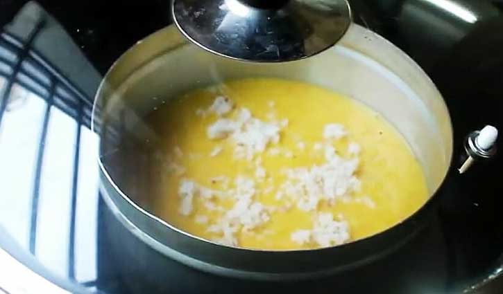 দ্বিতীয় ধাপ: এ পর্যায়ে বড় একটি স্টিলের বাটি বা কেকের মোল্ডে তেল ব্রাশ করে নিন। এরপরে এতে ব্যাটার ঢেলে দিন। চুলায় বড় প্যান বসিয়ে তাতে পানি ফুটতে দিন। পানি ভালোভাবে ফুটে উঠলে প্যানে একটি স্টিলের স্ট্যান্ড বসান। স্ট্যান্ডের ওপরে কেকের বাটি বসিয়ে দিন। তারপর প্যানের মুখ ঢেকে দিন। এভাবে মাঝারি আঁচে চল্লিশ মিনিটের মতো রেখে দিন। কেক হয়ে গেলে নামিয়ে ঠান্ডা করুন। এরপর পরিবেশন করুন।