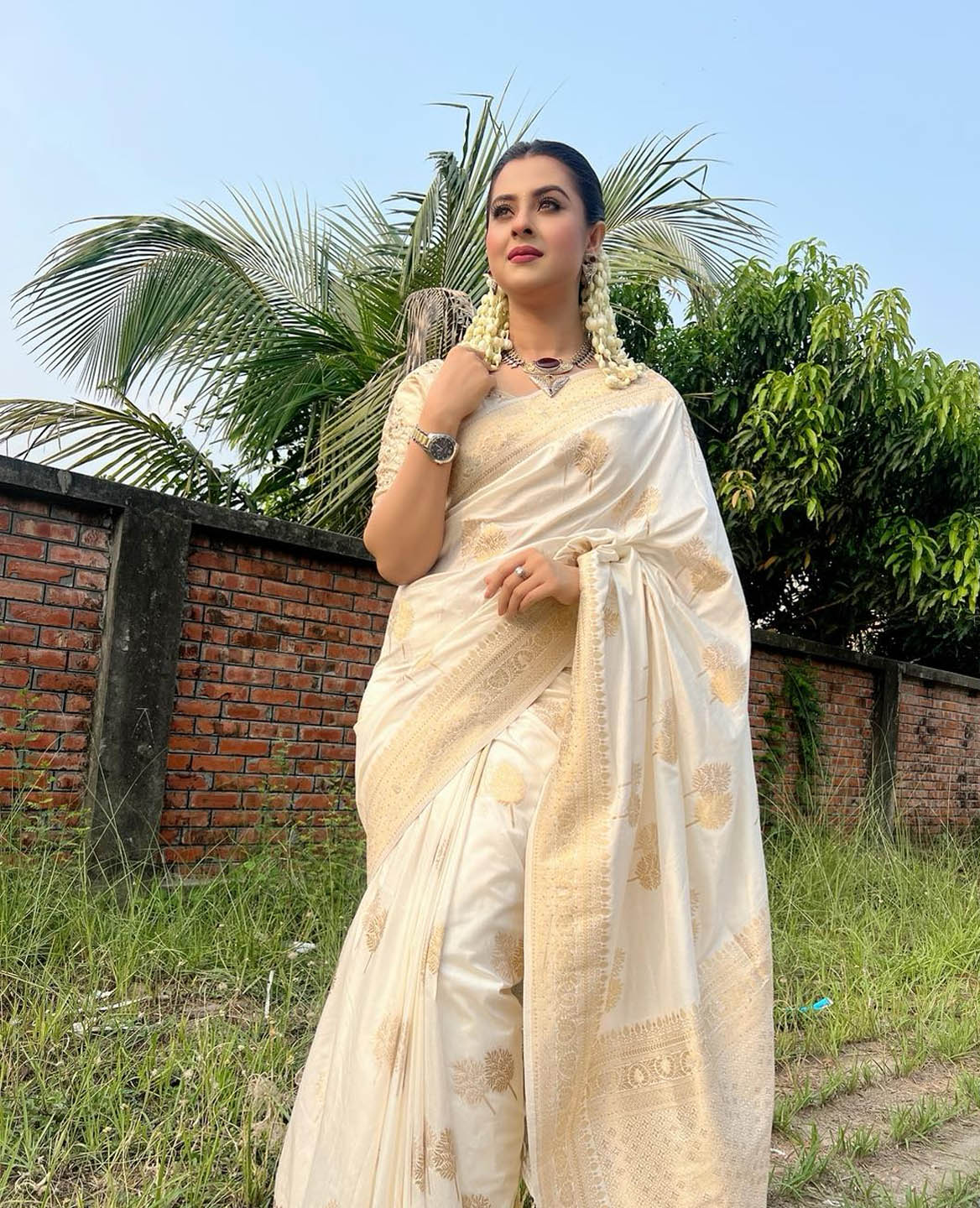 শাড়িতেও কম যান না বুবলী। নিজেকে শাড়িতে জড়িয়ে তৈরি করেছেন এলিগেন্ট লুক। খোঁপায় পরা বেলী ফুল তাকে আরও বেশি সিগ্ধ লুক এনে দিয়েছে।